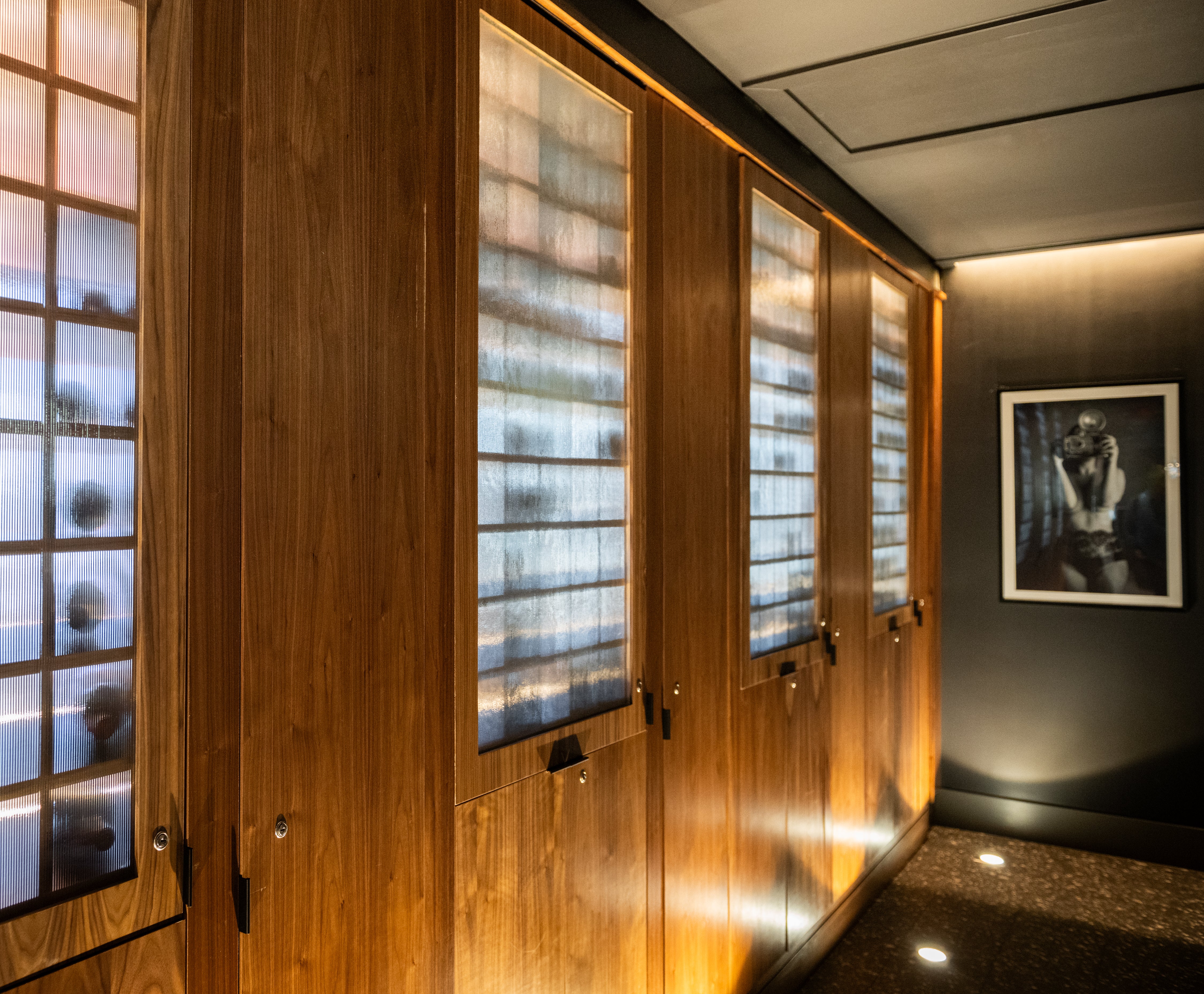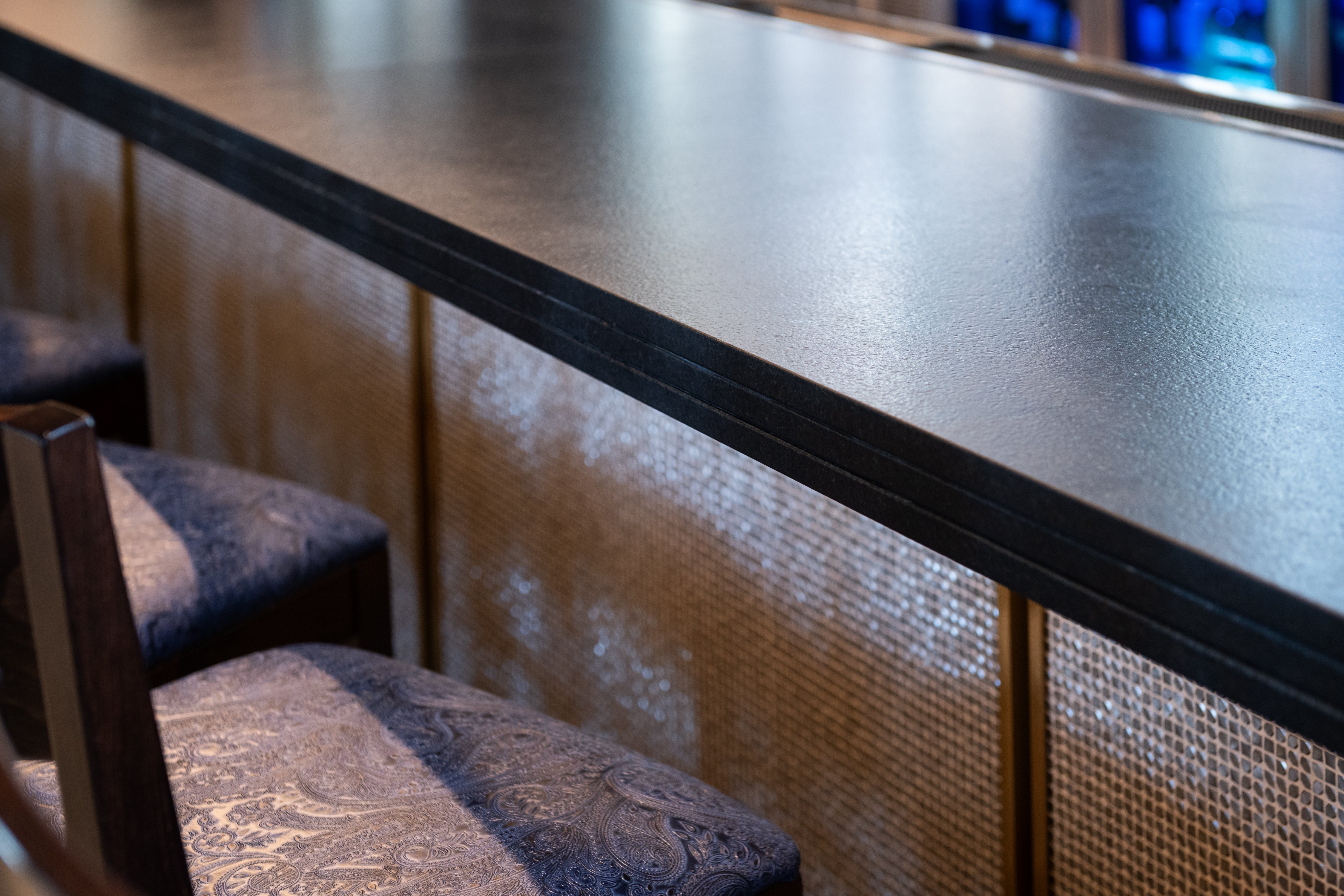 The bar is a real showstopper. With a sleek custom-designed top and backlit shelving, it gives off a subtle, modern glow that transforms the mood—especially in the evening.