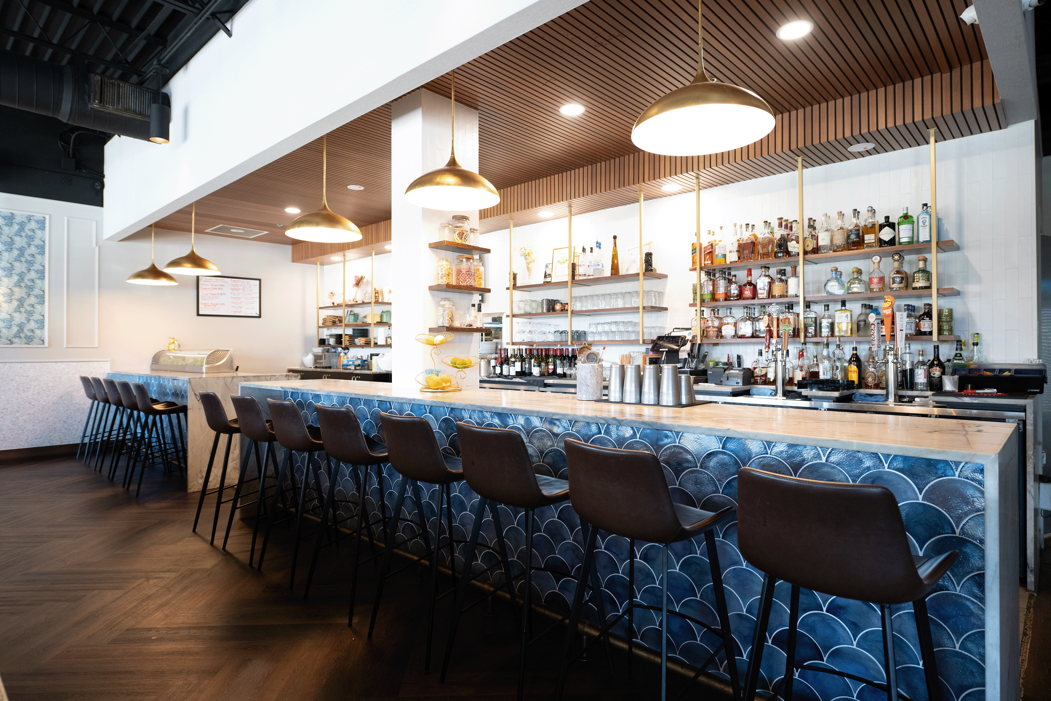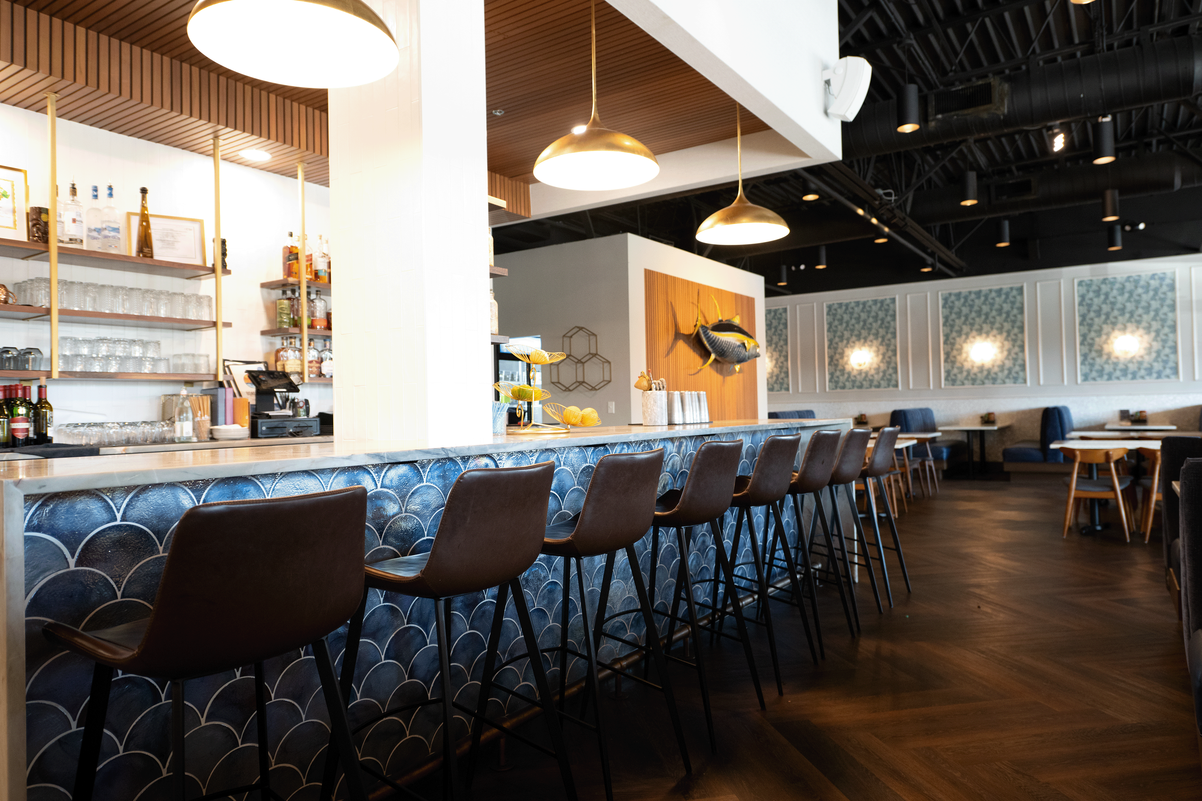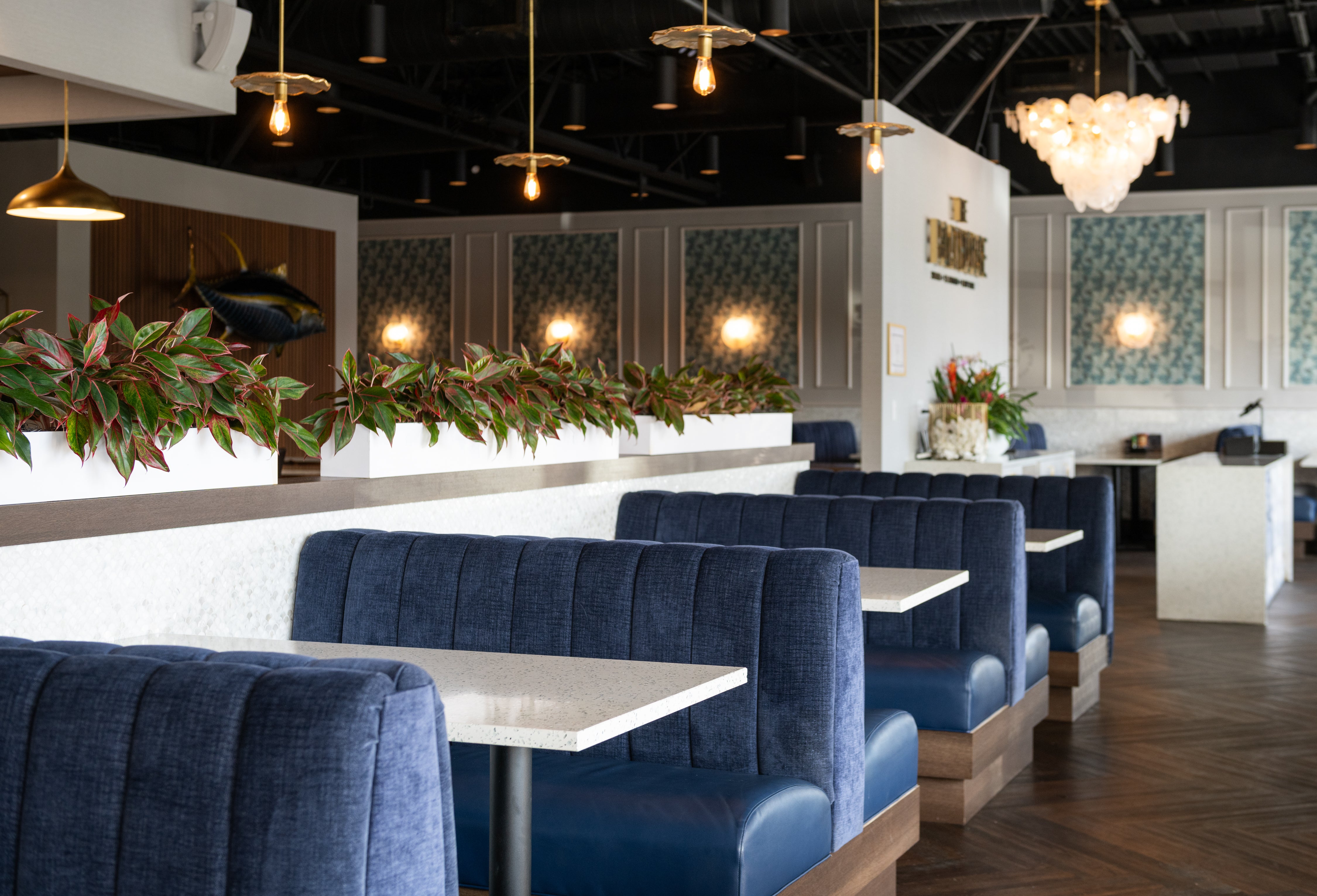 Step inside and it’s clear—comfort and style are in perfect balance. The Boathouse features a mix of crisp, coastal-inspired banquettes and contemporary dining chairs that echo the color of the nearby ocean. Clean white walls, wood tones, and subtle navy accents set the scene, while the curated mix of light fixtures add a touch of warmth and texture.
