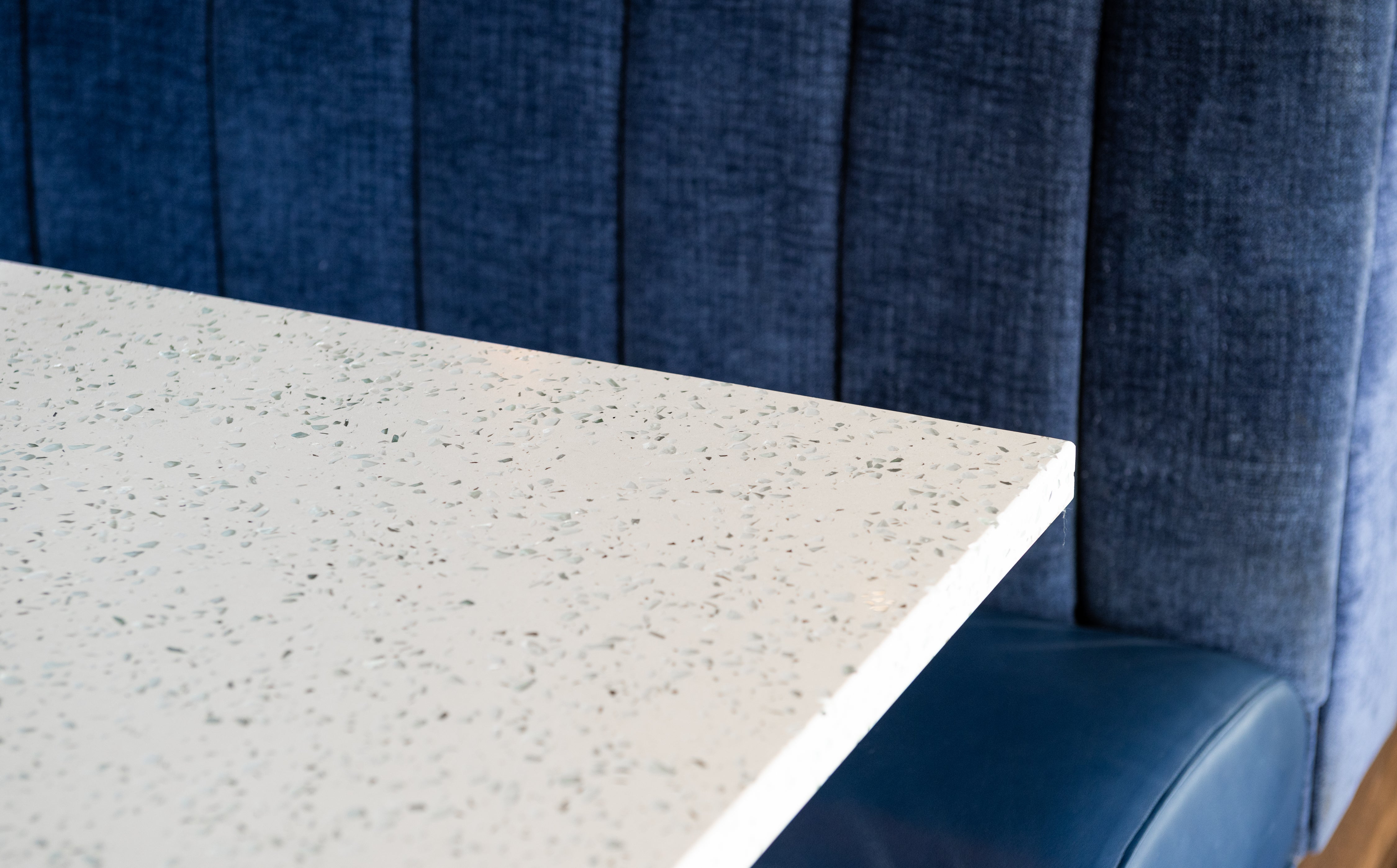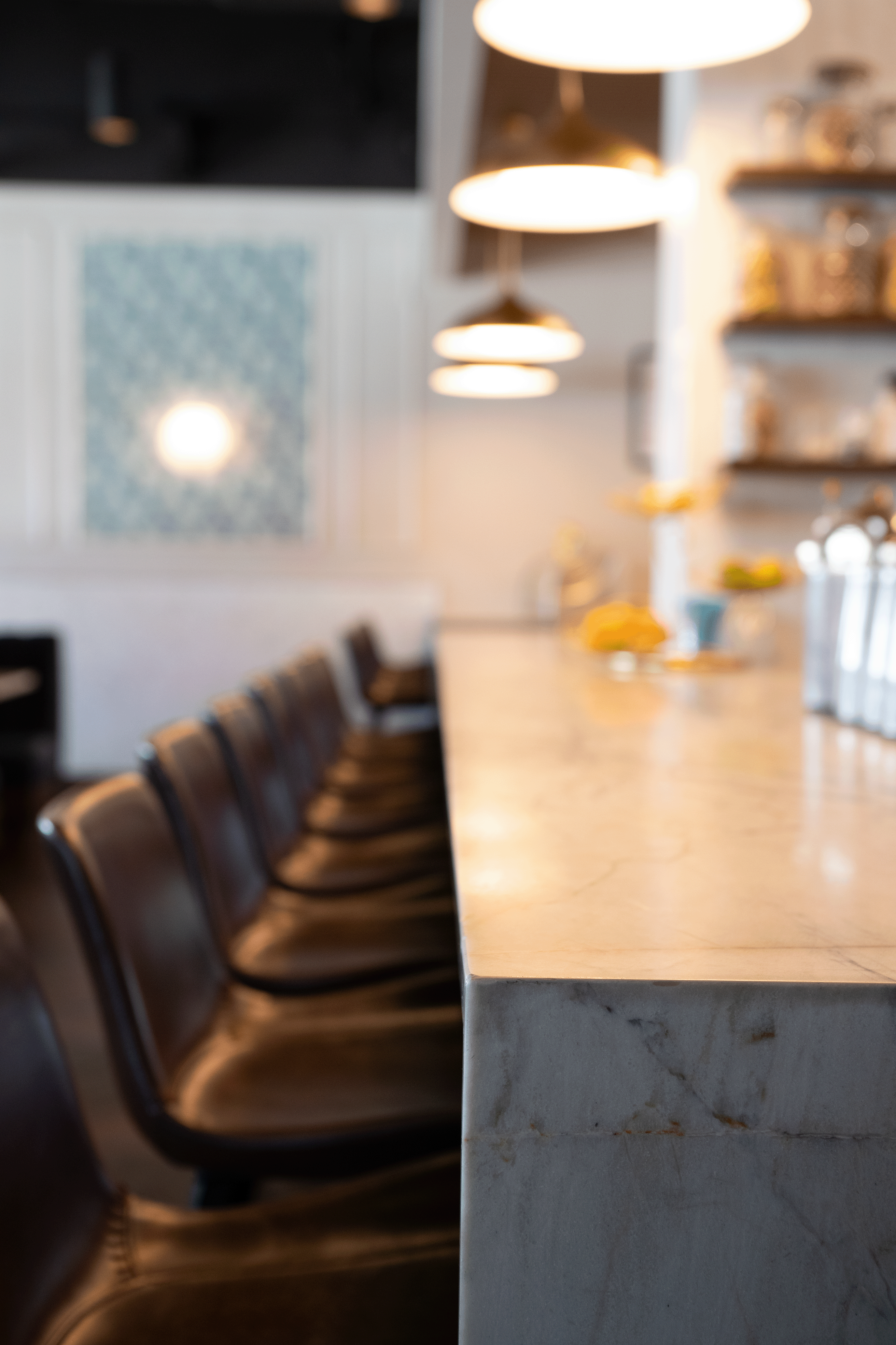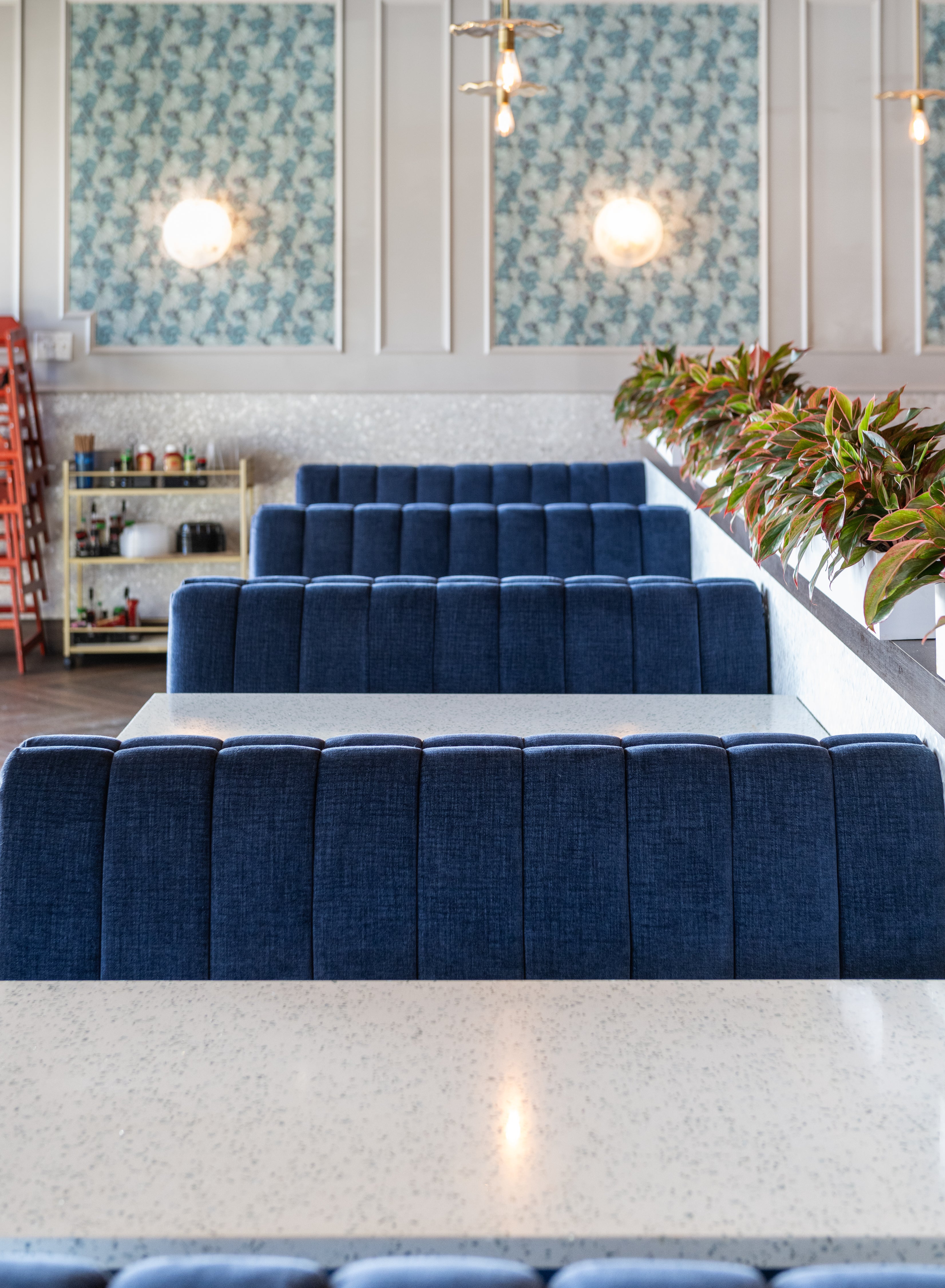 Step inside and it’s clear—comfort and style are in perfect balance. The Boathouse features a mix of crisp, coastal-inspired banquettes and contemporary dining chairs that echo the color of the nearby ocean. Clean white walls, wood tones, and subtle navy accents set the scene, while the curated mix of light fixtures add a touch of warmth and texture.